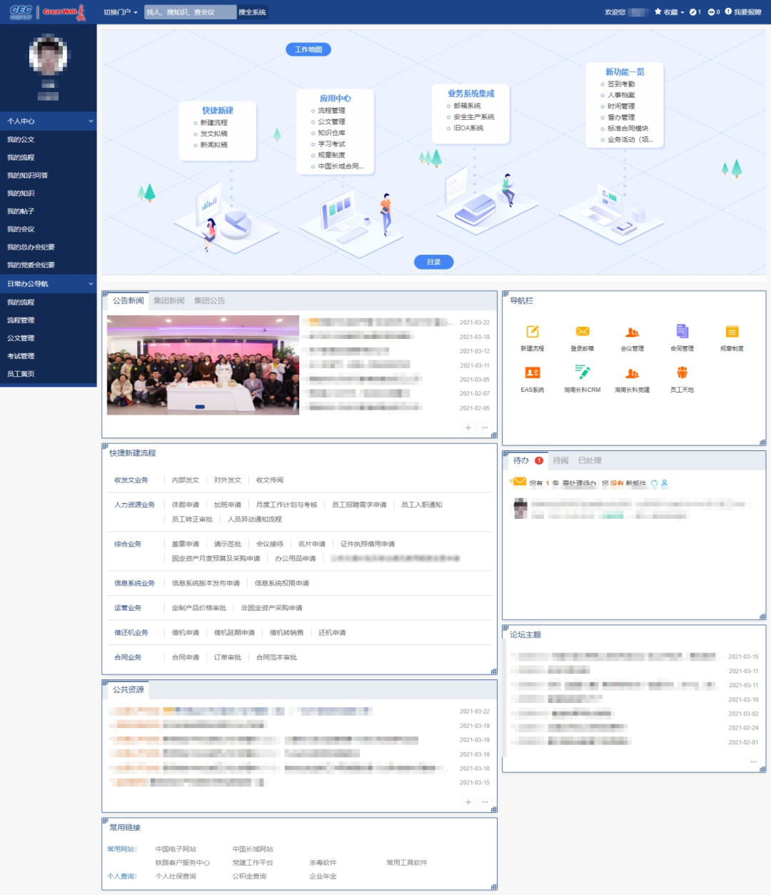 汇集流程管理、公文管理、新闻公告、公共资源等内部应用,并提供人事管理、财务管理、会议管理等常用业务系统便捷入口,支撑企业标准化、流程化、便捷化的高效运营。