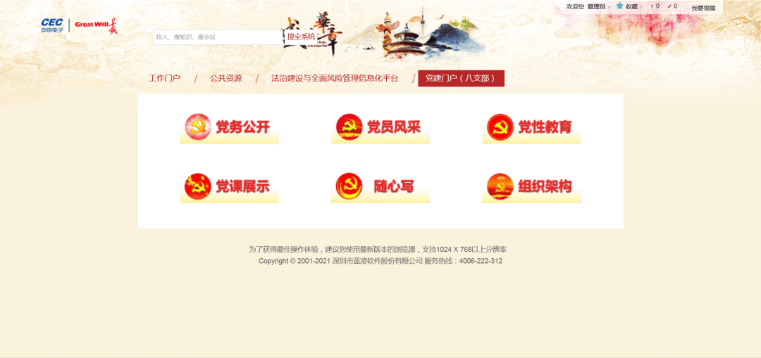 系统注册用户数9020人,并发用户3000;与21套业务系统深度集成,汇集18个第三方异构源,客户自行定制开发14个模块,已然成为中国长城最重要的核心系统。