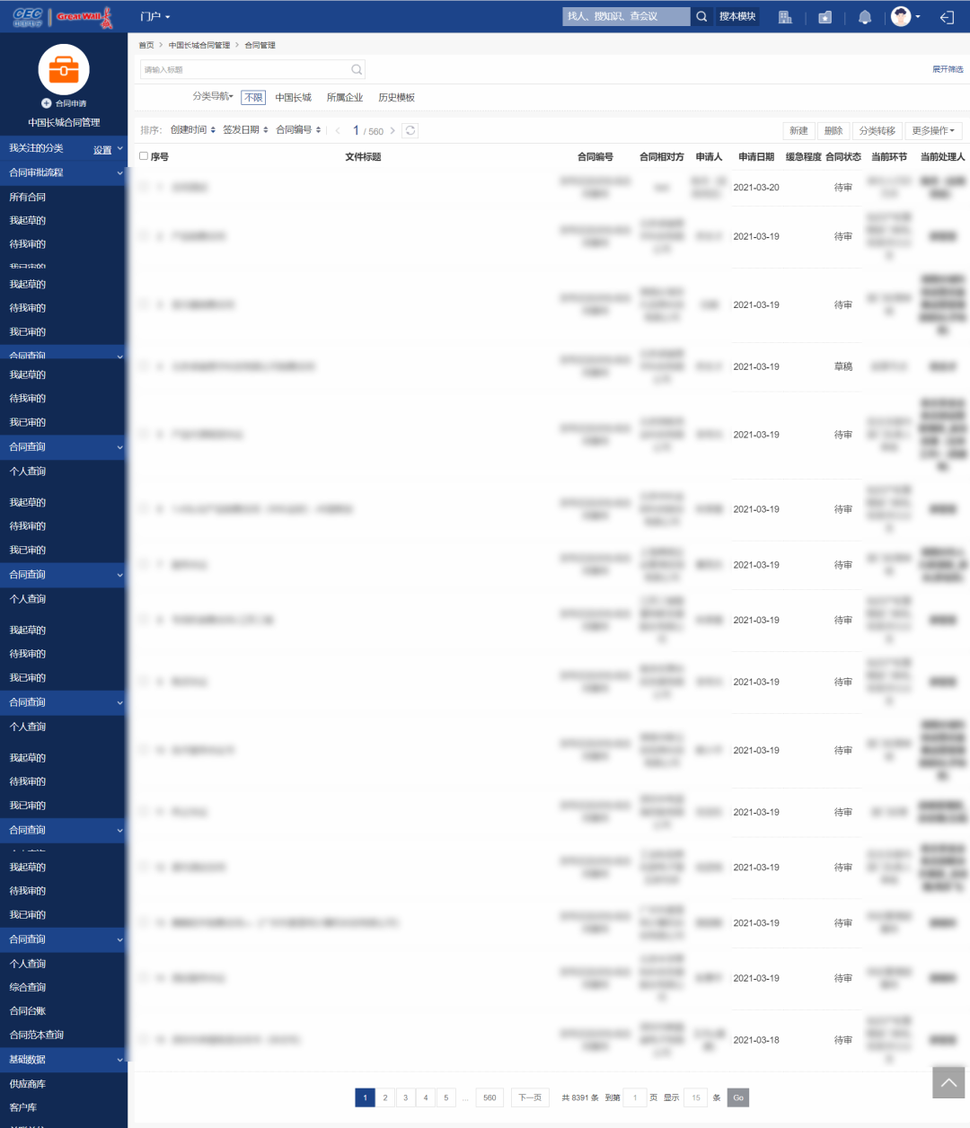 基于蓝凌会议管理模块,中国长城自行定制开发了合同管理,支持合同从起草、签订、履约、变更到结束全生命周期管理。
