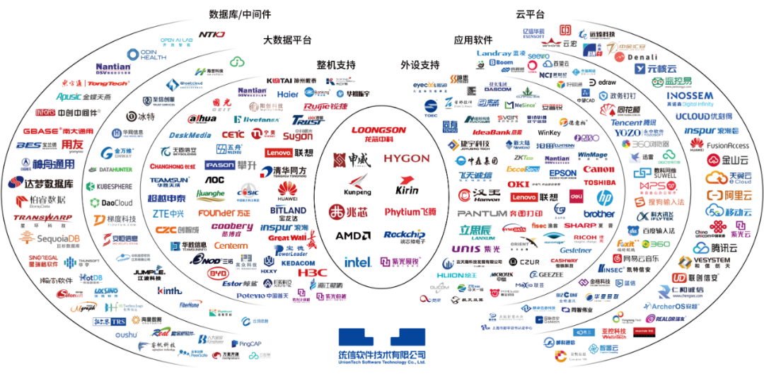 自成立以来,统信软件非常注重生态体系的构建,积极推动与信创产业上下游合作伙伴产品的兼容适配,实现了整机、外设、云平台、大数据平台、数据库、中间件、应用软件等全产业链的覆盖,能够满足各个行业国产化转型需求。