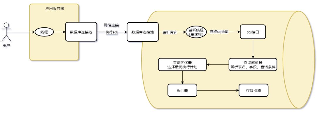 数据库连接池中的线程监听到请求后,将接收到的sql语句通过SQL接⼝响应给查询解析器,