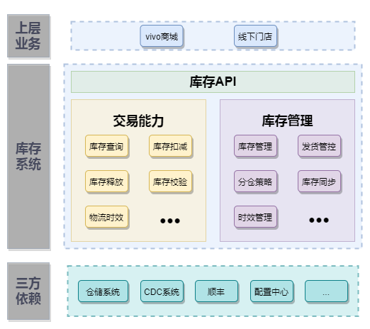 库存系统提供两个核心能力:交易能力和库存管理。上层业务方可以调用提供的API完成库存查询、库存扣减等操作;管理台可以按成分仓策略、库存同步等操作。