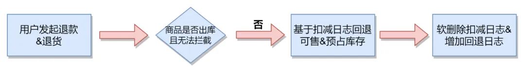 库存回退基本流程:订单出库前用户申请退款,回退可售库存、回退预占库存、软删除扣减日志、增加回退日志;一旦商品出库,用户申请退货走处理机流程,可售库存和实物库存均不回退。