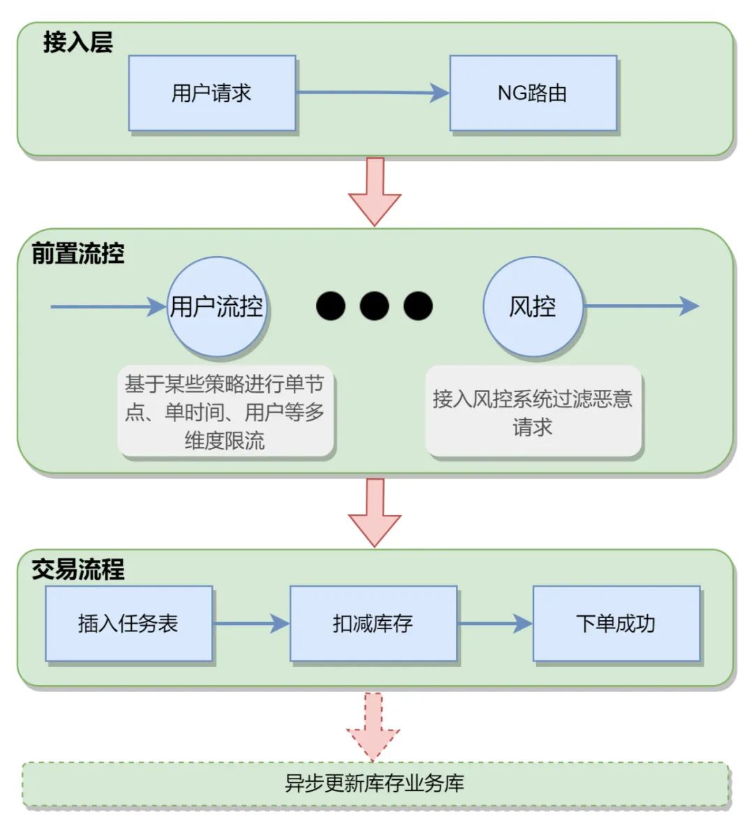 目前我们针对秒杀库存扣减,采用的是方案2。但毕竟涉及数据库的更新,为了避免风险,在前置流量校验上做了限制,保证流量的可控: