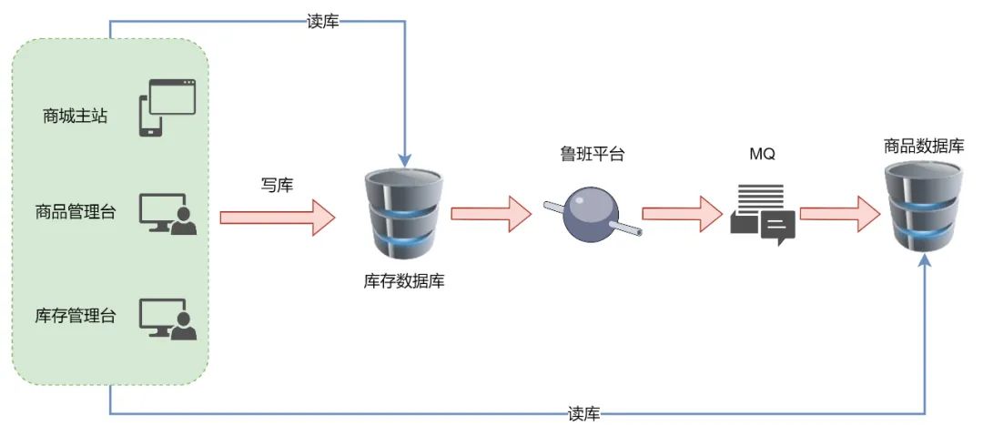 库存数据库发生变更后,鲁班平台通过binlog采集获取库存变更日志,再通过自定义规则筛选,然后发送mq变更消息,最后商品系统消费消息完成库存同步变更。