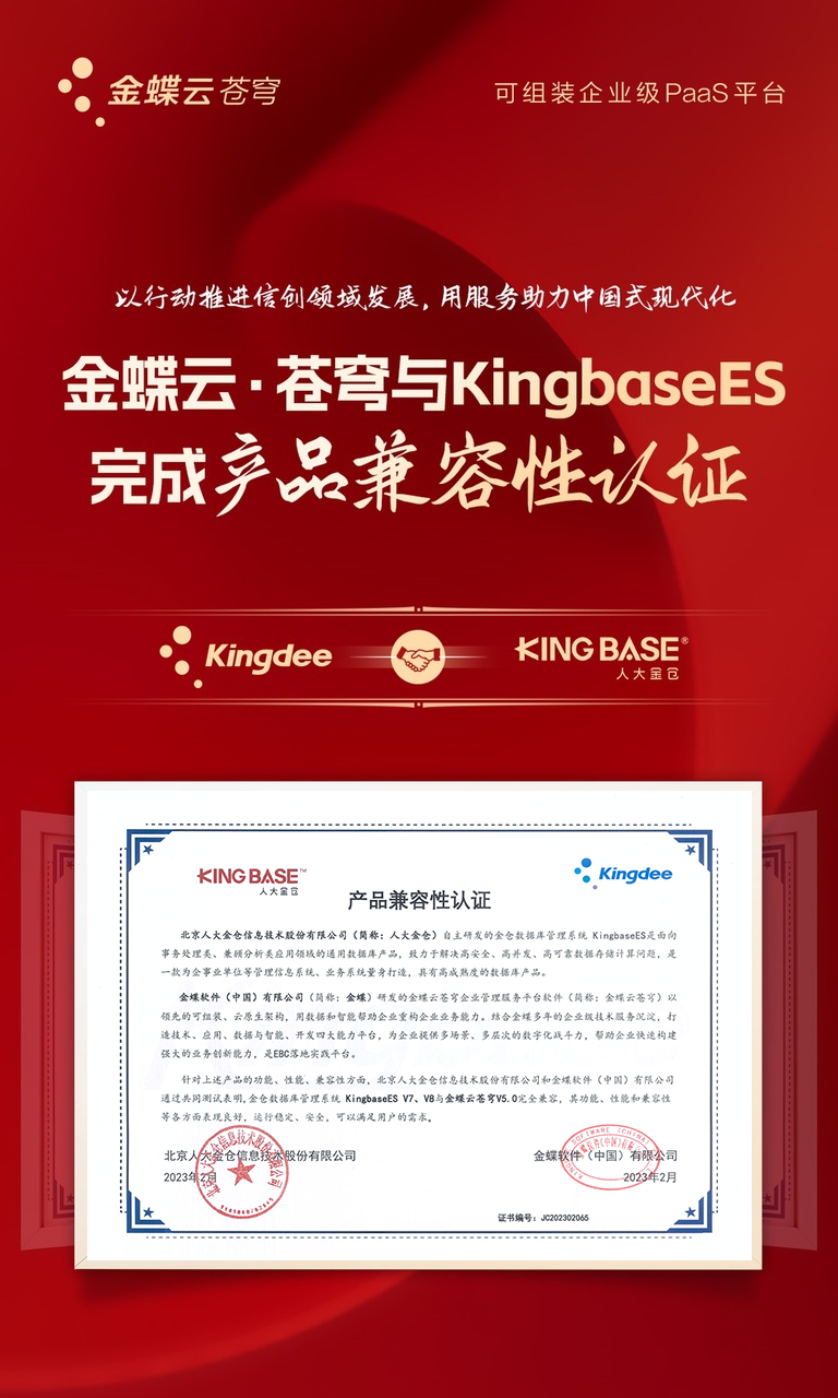 近日,人大金仓与金蝶软件(中国)有限公司(以下简称:金蝶)完成产品联合测试。测试结果显示,金蝶云·苍穹(V5.0)与金仓数据库管理系统 KingbaseES V7、V8完全兼容,其功能、性能和兼容性等各方面表现良好,运行稳定、安全,满足用户信创升级的需求。