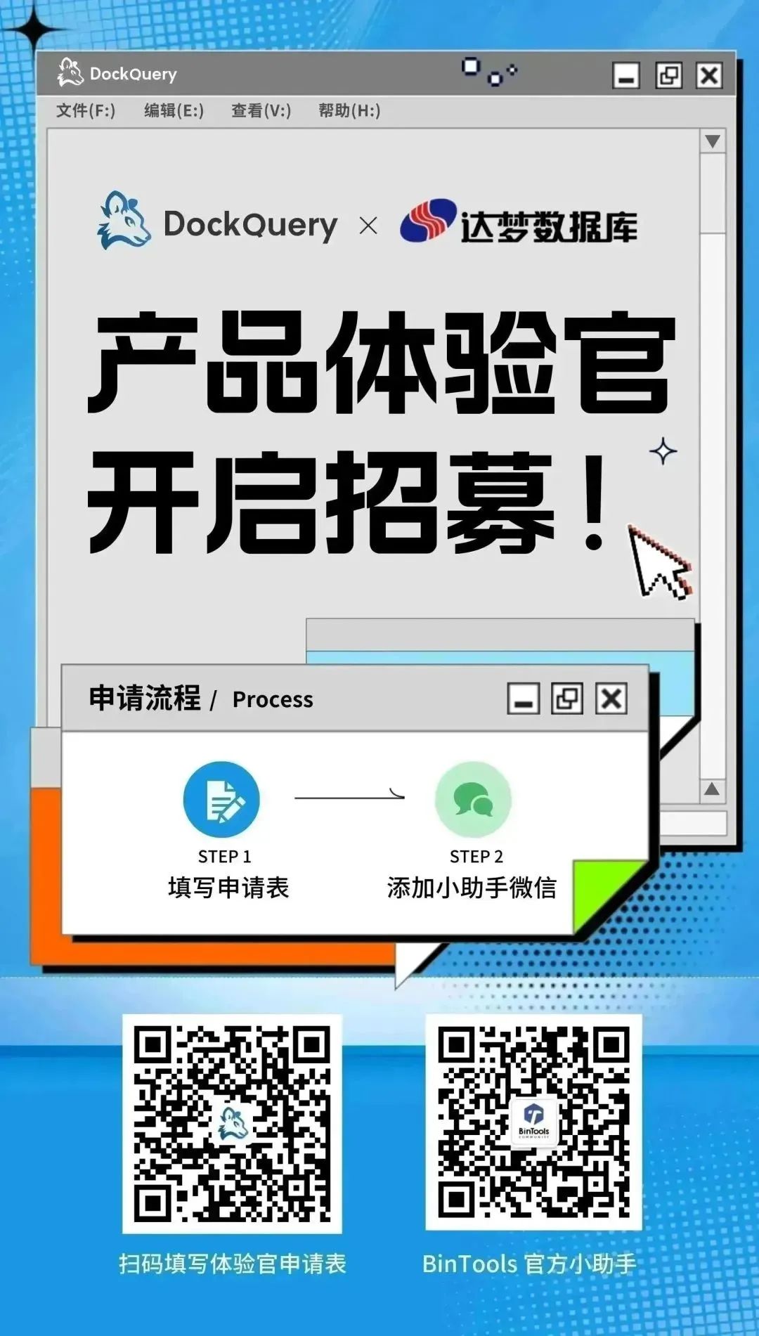 此外,图尔兹为快速推进对达梦数据库的支持力度,DockQuery现面向达梦社区招募专项体验官!欢迎加入DockQuery天狼专项体验官!扫描海报中二维码即可报名!