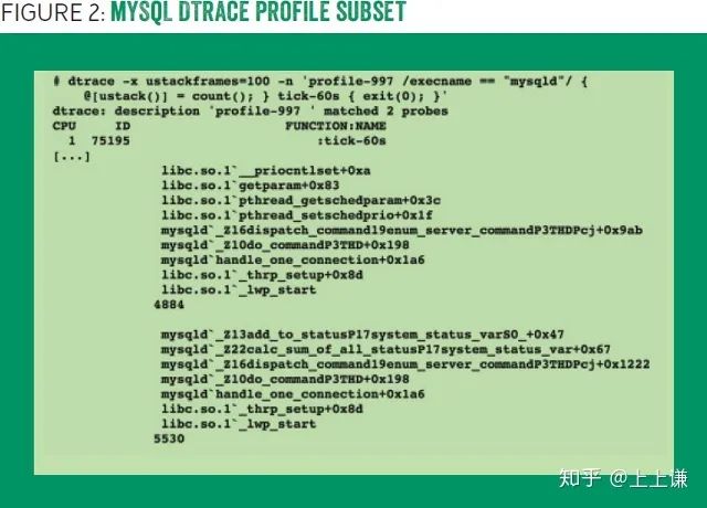 我们使用DTrace,以997 Hz 的频率连续采样stack traces 60秒,尽管DTrace对输出进行了压缩,输出还是有591622行,包括27053个stack traces,图二展示了输出结果,屏幕最下方显示的是调用最频繁的方法,说不定是问题的关键。