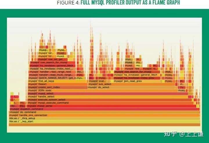 为了充分利用stack traces 层次的特性,我发明了一种可视化原型,如图四所示,展示了跟图三相同的信息。图片之所以选择暖色调,是因为这种原型解释了为什么cpu很“hot”,也正是因为暖色调和火焰一样的形状。这种原型被命名为“火焰图”。(可交互的svg格式的图4可以在http://queue.acm.org/downloads/2016/Gregg4.svg 体验)