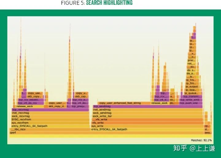 点击search或者按ctrl+f 来使用搜索功能。搜索功能支持正则表达式,所有命中的box会被高亮并被显示为紫色。同时,图片右下角会显示命中方法的总百分比。如图五所示。(可交互的图五可以在这里体验: http://queue.acm.org/downloads/2016/Gregg5.svg.)