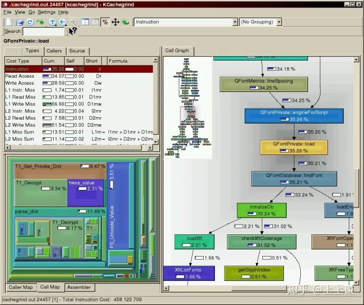 KCacheGrind 使用有向无环图实现可视化,使用宽度自适应的box表示方法,使用箭头表示调用关系,box和箭头上都标注了百分比。与Linux perf_events一样,图片缩小以后,也很难提供全局信息。