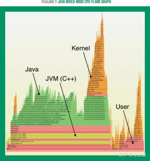 Perl版本的火焰图支持很多配色选项,其中一个选项是java。该选项通过不同颜色区分模块,规则如下:绿色代表Java,黄色为C++,红色用于所有其他用户代码,橙色用于内核模块。见图七(可交互的svg格式的图7可以在http://queue.acm.org/downloads/2016/Gregg7.svg 体验)。