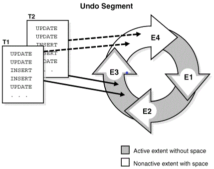 undo记录了每次数据变化中被覆盖的值,我们可以说它记录了数据变化时的前镜像值,例如一个事务将某数据从1改成了2,那么最终数据块记录的值应该是2,但是undo会记录下来更改前的值即1。undo数据是一个循环覆盖的结构,如下图: