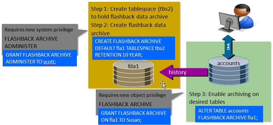 为了能够闪回到更久远的过去时刻,Oracle引入了FDA特性,即闪回数据归档,该特性最初在11g版本引入并被命名为Total Recall。它记录了数据库事务变化的历史值,将其固化在表空间中的闪回归档对象中保存,使开启了该功能的表可以不受undo覆盖限制,闪回到更远的历史时刻。