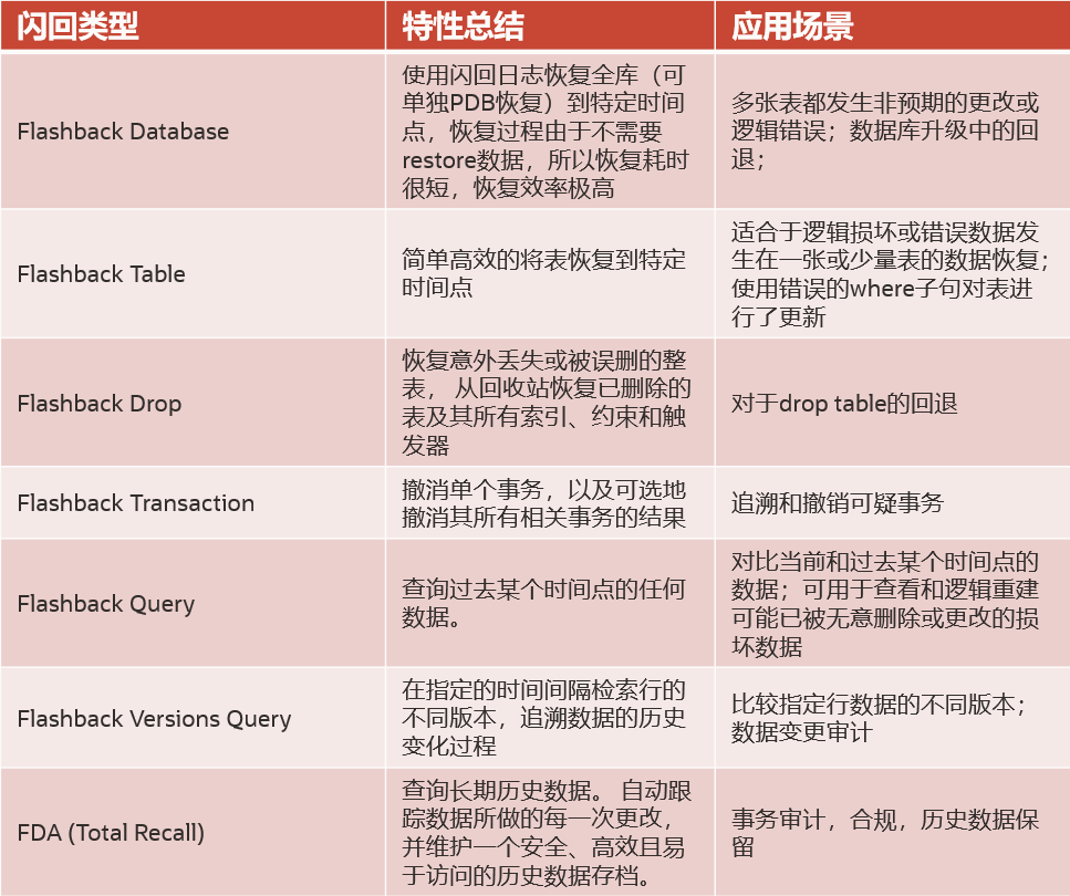 最后,我们以表格方式整理对比Oracle数据库的各项闪回技术,以及分别适合的应用场景。