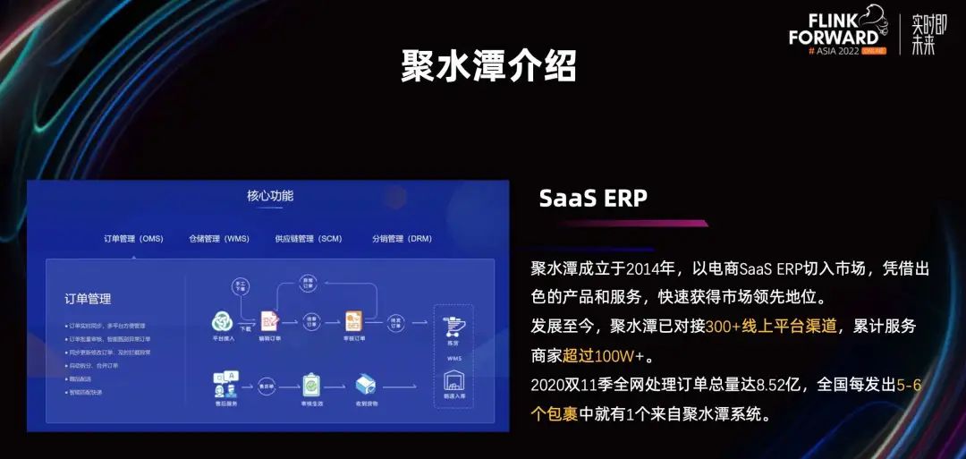 聚水潭是一家做电商 ERP 的公司,ERP 主要由四个模块组成,OMS、WMS、SCM、DRM,其中 OMS 是订单管理系统。从 2014 年发展至今,聚水潭已经对接了 300+线上平台渠道,客户通过我们的 ERP 产品可以统一做订单的管理,避免了需要去各个线上平台单独处理,全渠道也是由此而来。基于 ERP 的底座,我们的数据团队打造了为商家服务的实时数据中台,目前已经有两万+商家付费订阅。