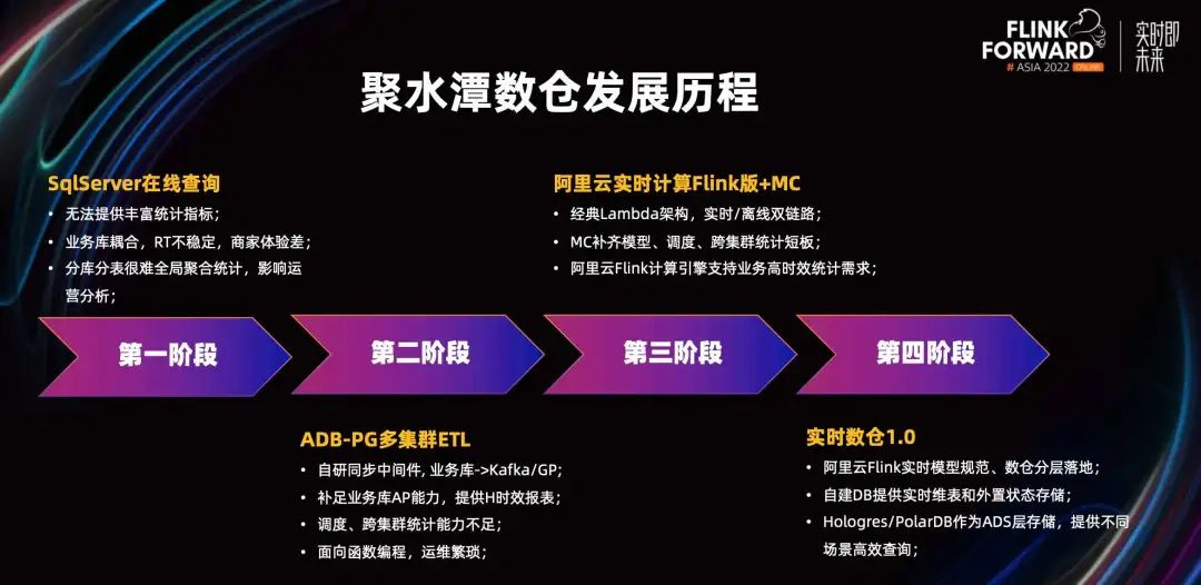 第二阶段,通过 AnalyticDB、多集群 ETL 做 T+1 的离线分析,补足 SqlServer AP 能力的不足。第三阶段,通过 Flink+MC 实现实时/离线 Lambda 架构的双链路,MC 补齐了模型、调度、跨集群统计的短板。计算引擎实现了秒级更新,支持业务高时效的统计需求。第四阶段,实时数仓 1.0 落地,通过 Flink 实时模型规范、数仓分层落地,包括自建 DB 提供实时维表和外置状态存储,用 Hologres/PolarDB 作为 ADS 层存储,提供不同场景高效查询。