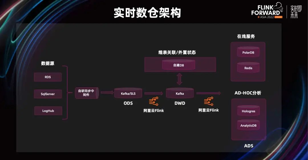 上图是我们实时数仓的架构。我们大多数的数据都在 SqlServer 的业务库,然后通过我们自研的同步中间件,同步数据到 Kafka 或者 SLS 里,作为 Flink 的 ODS 层。接着通过 Flink 清洗到 DWD 层,DWD 层和我们自建 DB 做了很多维表关联,包括外置状态交互。接着通过 Flink 做 ADS 层的聚合运算,ADS 的结果根据不同的业务场景落到不同的存储引擎里。目前在聚水潭主要分为两个模块。第一个是在线服务,它目前支撑我们的实时数据门户、实时大屏的业务场景,主要由 PolarDB 和 Redis 承接。第二个是 AD-HOC 分析,它目前支撑实时物流场景,主要由 Hologres 和 AnalyticDB 承接。聚水潭的数据中台主要为商家服务,基于商家的看数场景,我们抽象了三个核心要素,分别是角色、数据、场景。简而言之,就是什么样的人,在什么样的场景,看什么样的数据。下面通过两个场景,带大家感受一下,为什么我们要通过实时计算的方式来满足商家高时效的看数需求。