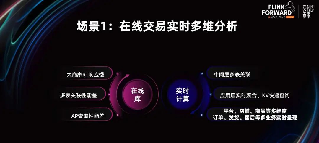 场景 1:在线交易实时多维分析。商家运营人员经常要面对在线交易实时多维分析的场景。最开始我们通过在线库提供简单的支持,但在线库有大商家 RT 响应慢,多表关联性能差,AP 查询性能差的问题。所以我们基于实时计算,在中间层做多表关联,在应用层实时聚合,将数据量级降低。通过 KV 做快速查询,来满足商家高时效的快速场景。