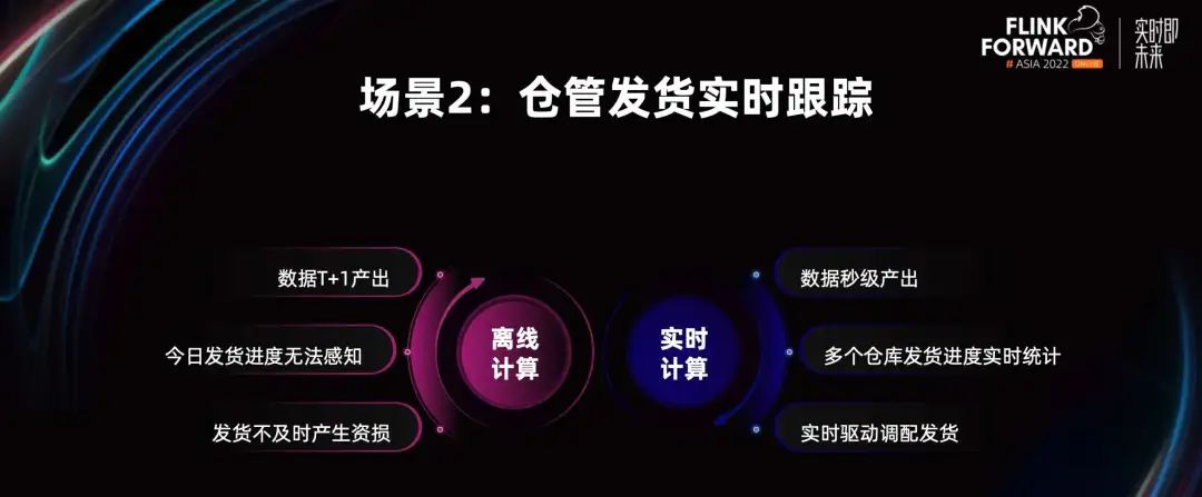 场景 2:仓管发货实时跟踪。我们的商家很多都有自己的仓库或者三方仓库,对于仓库内的仓管,他们需要对每天的发货情况做实时跟踪。最开始我们通过离线计算的方式产出 T+1 的数据,但这就会导致今日发货进度无法感知,发货不及时产生资损,所以商家有很强烈的实时看数需求。我们通过实时计算保证数据的秒击产出,且我们提供了多个仓库发货进度的实时统计,仓管可以基于我们的实时分析数据来做实时驱动,调配发货。
