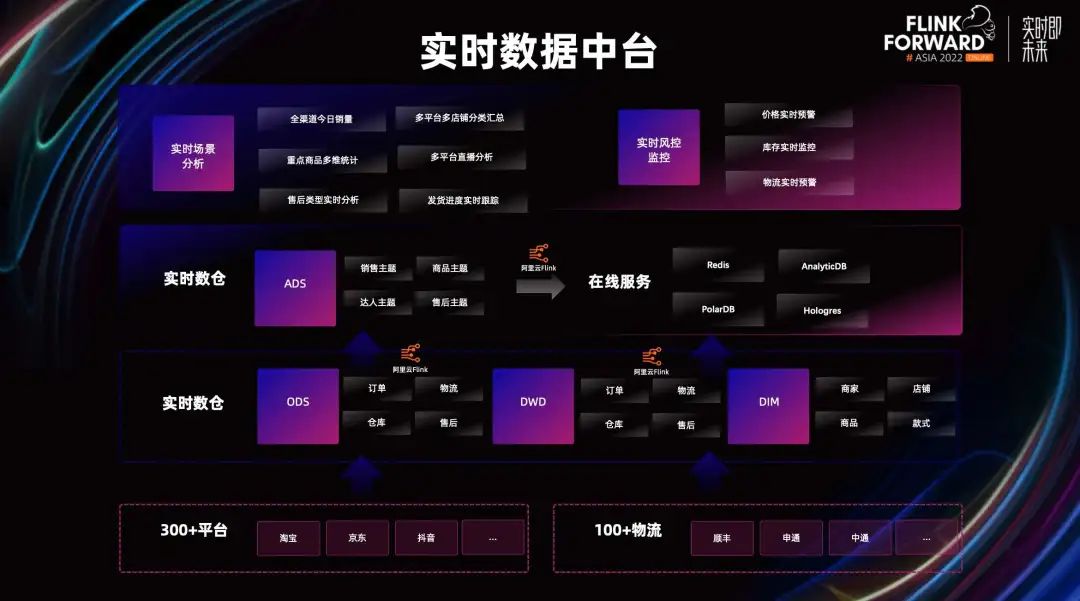 上图是我们实时数据中台的完整架构图。目前最底层的数据源已经对接了 300+平台,100+物流公司,通过实时计算的分层来支撑多业务场景、多主题的数据分析。目前我们的实时场景可以分为两部分,实时场景分析和实时风控监控。实时场景分析可以分全渠道今日销量统计、多平台多店铺汇总统计、重点商品多维统计、多平台直播分析、售后类型实时分析、发货进度实时跟踪。实时风控监控目前做的比较多的是物流实时预警,未来将要做的库存实时监控、价格实时预警。