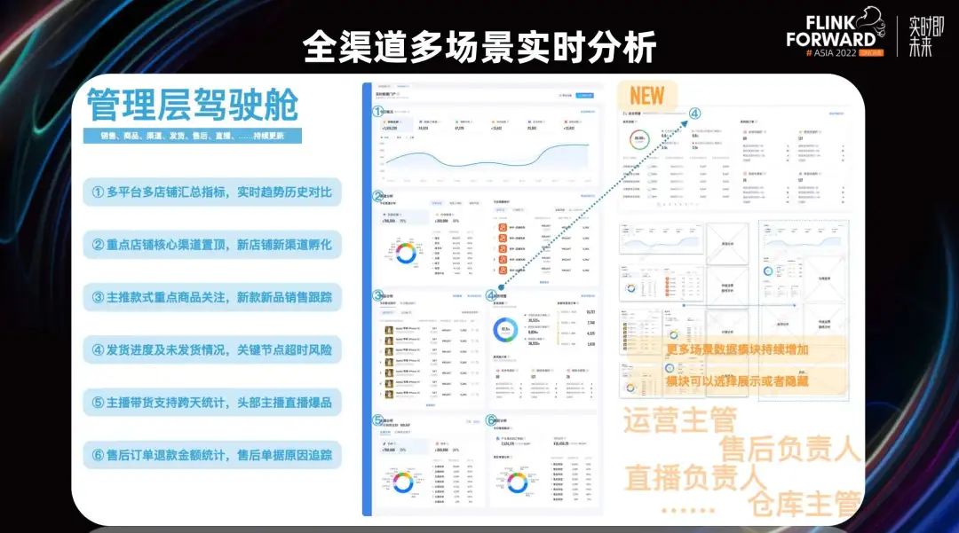 商家的业务同学可以大致分为运营同学、售后同学、直播同学、仓库同学。他们在我们的实时门户里都能找到自己对应的业务场景,满足他们实时看数的需求。大致我们分为了以下六个板块。以上板块可以满足不同的业务同学,其中“多平台多店铺汇总指标、重点店铺核心渠道置顶、主推款式重点商品关注”可以帮助运营同学快速响应。“发货进度即及发货情况”可以帮助仓库同学做发货的实时跟踪。“主播带货支持跨天统计”可以帮助主播做跨店统计。“售后订单退货金额统计”可以帮助售后同学做售后订单的实时跟踪。
