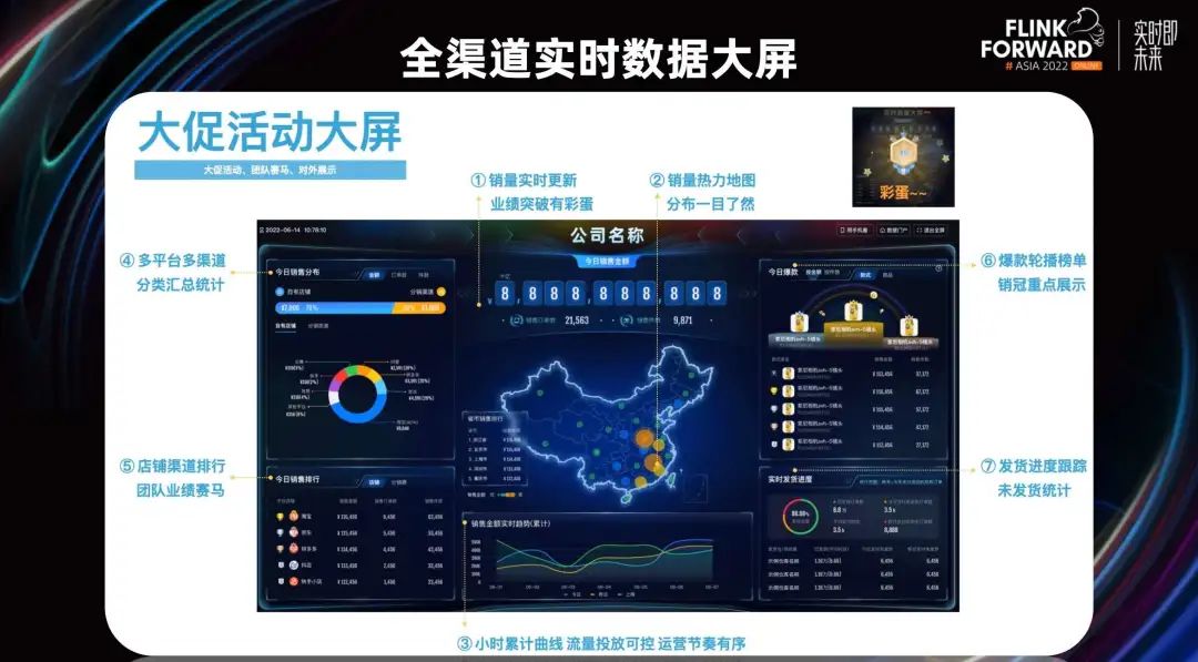我们的全渠道实时数据大屏主要满足商家平时或者大促阶段的投放诉求。不但涵盖了实时数据中台的大部分模块,又做了销量热力地图,让分布一目了然。1. 多流关联。这里特指多事实流状态关联,关联周期长。2. 大状态管理。它可能会有 TB 级的状态,甚至更大,且它的 TTL 可能会超过一个月。