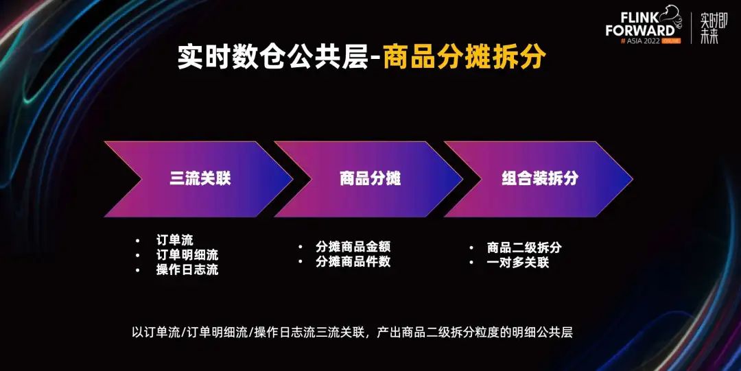 举个例子,商品分摊、拆分是 Flink 的一个任务,它属于数仓的公共层。这个任务背景是客户想要看到商品粒度金额、件数、成本价等等信息。对于这样的需求,我们把整个流程拆成三步。1. 三流关联。三流分别是订单流、订单明细流、操作日志流。订单流里是支付时间等基本的订单信息;明细流里是商品粒度的成本价等信息;操作日志流会记录一些删除的信息、update、更改其他字段的信息。关联之后的数据,我们再根据业务逻辑做商品分摊。2. 商品分摊。这一步我们会把订单上的金额,分摊到具体的每个商品上。这样我们就可以得到商品的金额和件数了。3. 组合装拆分。它有个特殊的业务场景,商家会把不同的商品打包成另外的商品来卖。比如 a 和 b 商品,会打包成 c。如果发生 c 的订单,需要拆分成 a 和 b 做统计,具体去看它的成本价和销售金额。
