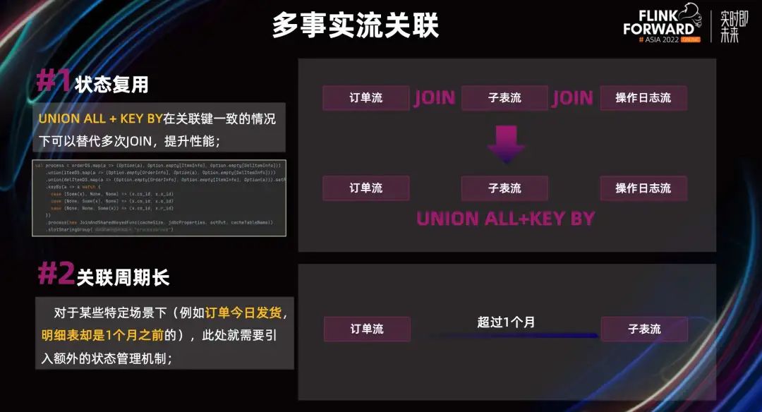 在上面的场景中,有一个多事实流关联的问题。最初我们是用 Join 来解决的,也就是把三条流分为两次 Join 去解决,但任务效率不太理想,状态也较大。之后我们参考了一些行业案例,并了解到 UNION ALL+KEY BY 是关联键一致的,所以后来我们用 UNION ALL+KEY BY 替代了多次 Join。这个方案的原理是我们可以复用它的状态,即 UNION ALL+KEY BY 每条流的状态只保留一份,而 Join 保留多份。另外,多事实流关联还有一个关联周期长的问题。在某些场景下,比如订单今日发货了,而明细表却是一个月前的,这时它的状态保留时间不确定,甚至可能超过了一个月。对此,我们会引入额外的状态管理机制。