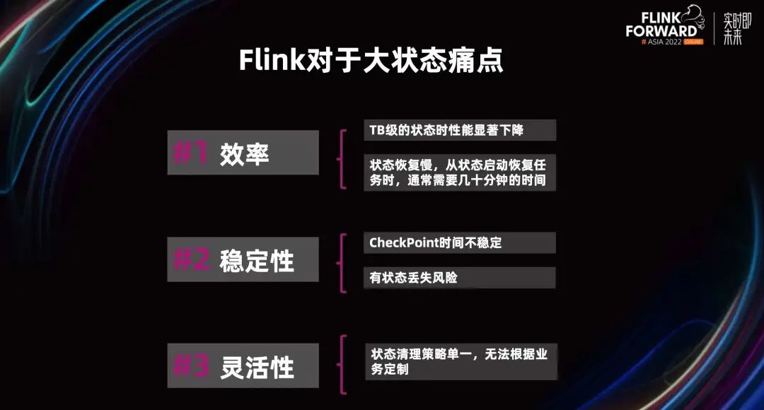 在分享状态管理机制前,先来阐述一下 Flink 对一些大状态的痛点。1. 效率。效率问题在小状态的时候是没有问题的,效率很快,但当状态达到 TB 级别,甚至几十 TB,它的读写效率就会显著下降,且状态恢复任务的时间也比较长,通常需要几十分钟的时间。2. 稳定性。Flink 的状态越大,Checkpoint 的时间越长,这就会导致一些延迟的波动,也就会不满足我们对于高时效的要求。3. 灵活性。目前社区版 Flink 和商业版 Flink 都只提供了 TTL 这个清理策略,所以我们无法根据业务的一些特性,定制删除这个状态。