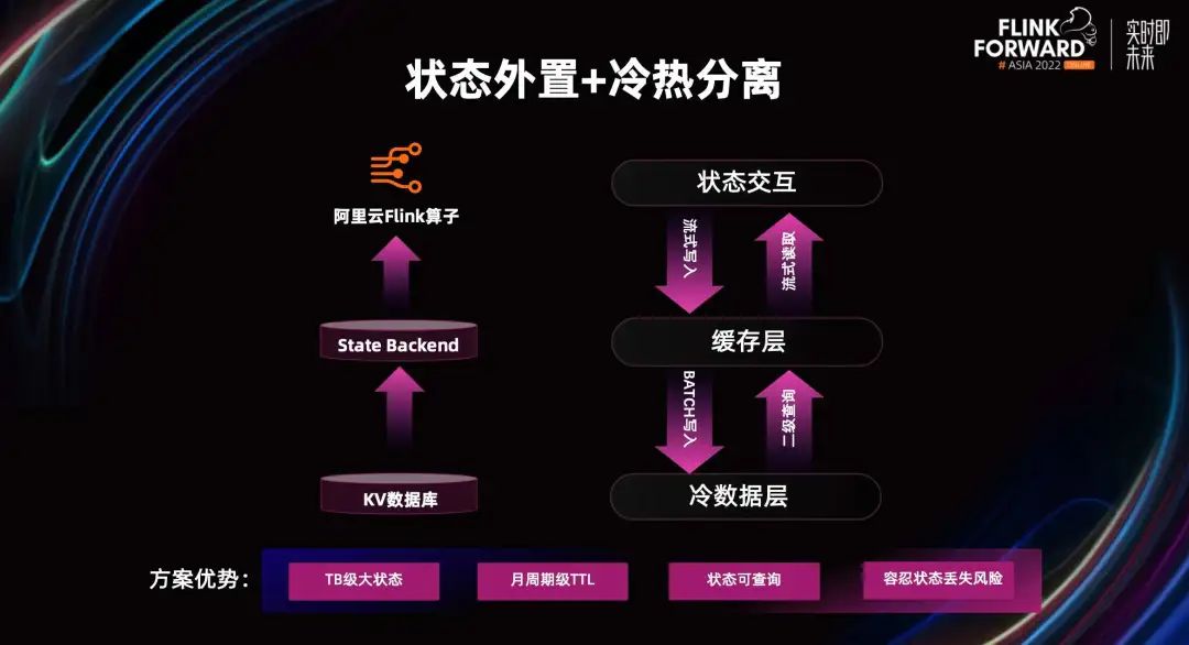 基于以上痛点,我们提出了状态外置+冷热分离的方案。对于大状态的业务场景,我们会把状态完全外置到 KV 数据库里,然后把 StateBackend 作为外置数据库的缓存。在缓存里 Flink 算子与数据交互,优先读取 StateBackend 的数据,当流式读取读不到的时候,才会走到外置的冷数据层,也就是外置的 KV 数据库。这样我们就可以尽量减少的访问外部的数据库了。写入的过程也是 StateBackend 流式写入,但写入冷数据层是 Batch 写入。它虽然不能保证 StateBackend 和 KV 数据库的状态一致性,但我们的业务场景是 AtleastOnce 语义,可以在代码里判断它的业务逻辑,通过业务逻辑规避数据重复。1. 可以支持更大 TB 级的大状态。大状态的大小取决于外置数据库的存储大小。2. 月周期级别的 TTL。这个 TTL 可以非常长,可能超过一个月,但它的效率比较高,因为 80%的数据都走到了缓存层。3. 状态可以查询。比如你可以清晰的定位状态的流转变化,通过 SQL 语句查询当前的状态。另外,我们也可以容忍状态丢失风险,比如 StateBackend 由于版本升级或者其他原因,它的状态消失了,我们可以从 KV 数据库无状态重启。