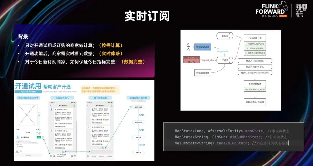 在实时订阅场景中,我们需要对商家保证比较稳定,且延迟非常低的实时性体验,这就要求我们需要保障任务的稳定性和延迟。在这个任务里,我们的服务包括:1. 按需计算,即只有开通或者订购的商家才会做计算,这样可以节省成本。2. 商家开通功能后,需要实时看到数据,这就要求我们的订阅逻辑也需要是实时的。3. 我们需要保障今日新订阅商家今日指标的完整性,不能从第二天才开始算。