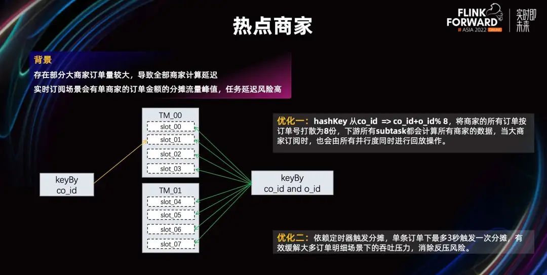 热点商家业内俗称数据倾斜。数据倾斜问题我们有两种解法。第一个优化是订阅流的。我们把本来按照商家粒度聚合的数据打散成商家+订单粒度来聚合。之前视为商家粒度,如果某个商家的数据非常大,它会分发到 TaskManager 下面的某一个 slot,导致 TaskManager 的 CPU 一直拉满。这样它就跑不下去了,延迟也会相应变高。做了打散优化后,可以让所有的 TaskManager 同时触发订阅逻辑,任务的稳定性相对就提高了。第二个优化,针对分摊任务中有主表和明细表关联的时候,明细表可能出现了几十万条甚至上百万条,主表和明细表关联时的 Key 就会非常大。这时我们把时间窗口划分为 3 秒一个窗口注册定时器,通过定时器触发分摊动作,限制单条订单下最多 3 秒触发一次分摊,有效缓解反压问题。