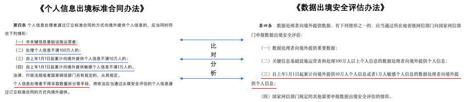 两部办法在数据出境的基本要求上,都是从属性、属性级别、出境数据/个人信息的数量、出境数据/个人信息的数量范围的角度进行的量化。