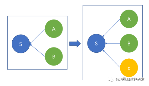 案例1:如图所示,服务A和服务B会调用服务S,开始的时候一切正常相安无事。后来增加了服务C也会调用服务S,服务C调用服务S的时候发现服务S有个实现上的缺陷,此时理论上应该修改服务S,但由于负责服务S的团队怕影响其他现有服务所以并没有解决该问题的动力,或者由于负责服务A的团队正忙于其他新特性开发,所以服务C的团队不得不曲线救国,在自己的服务C中实现workround。一段时间以后,服务B也发现了服务S的缺陷,同样也是自己采用了workround。容易想到,服务B和服务C采用的workround可能并不相同,这为以后的维护埋下了坑,这些都在积累系统的随机复杂度。