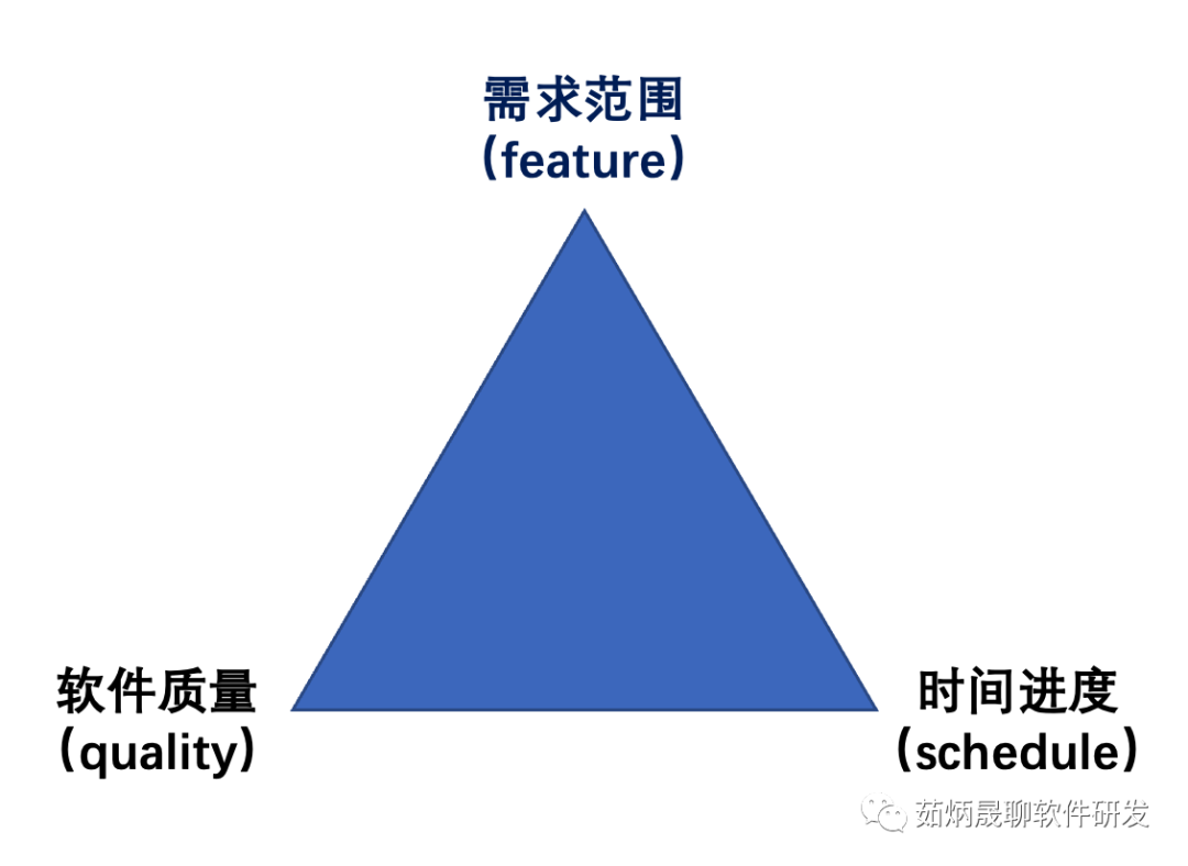 最常见的错误方式是采用Deadline Driven Development,用deadline来倒逼研发团队交付业务功能。但大量的实践经验告诉我们,软件研发就是在需求范围(feature)、软件质量(quality)、时间进度(schedule)这个三角中寻求权衡。