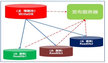 这里有三种角色,主库,发布服务器,从库;三者的关系为:主库发布数据库结构或者数据到发布服务器,从库从发布服务器订阅;主库第一次发布,发布数据库结构;是把数据的结构,通过镜像文件发布到发布服务器。多个从库去订阅,直接通过镜像拷贝把数据库结构拷贝生成从数据库库;那么后面如果主数据库中有数据更新,新增、修改、删除数据以后,数据库会生成日志,那么主数据库生成日志后把操作日志,发布到服务器服务器,多个从库在发布服务器订阅得到日志,然后通过日志恢复数据;通过日志回复数据很快,但依然有延迟;只不过延迟很小!那么数据的扭转过程为:增删改操作主库,主库同步数据到从库,查询到从库查询,这就是读写分离;那如何配置读写分离呢?针对于SqlServer朝夕教育有专门的配置说明文档,请联系助教老师获取即可;QQ:986960462、1432568536