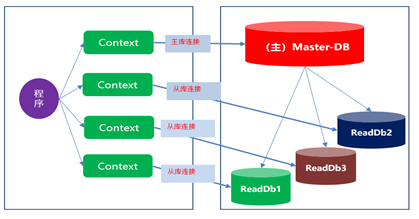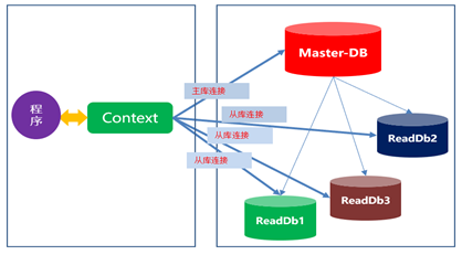 EFCore的使用,是基于上下问Context来对数据完成一一系列增删改查操作,Context里面包括了对数据的各种配置,包括数据库连接,数据库映射等。一个数据库对应一个Context;那么数据库读写分离以后,是多个数据库了;怎么办呢?有两种方案,多数据库多个Context; 还是每个数据库对应一个Context; 或者一个Context多个数据库连接;如图2,图3。