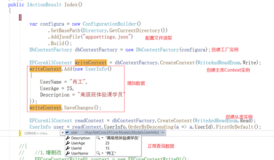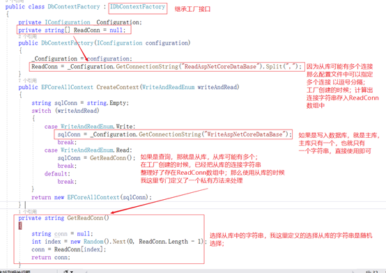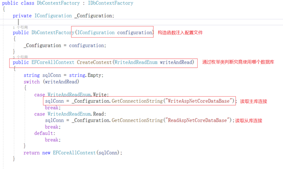 我们来分析一下如果代码这么写有没有什么问题。如果代码这样写,上端调用方,还得决定,究竟使用哪个数据库;判断使用的数据库连接字符串;在实际开发中,数据库连接字符串肯定是配置在配置文件中的;在Core开发中像类的实例创建一定必然是通过容器来创建的;如果有多个从库呢?上端还得选择使用从库中的那个字符串;程序开发中,这样做不好,上端调用方需要处理的事情太多,知道的也太多。