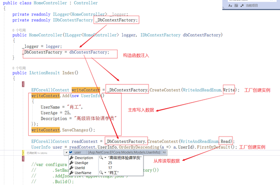 第五步:调试测试;如图14,把工厂注入到控制器,让工厂创建Context实例;数据正常查询;