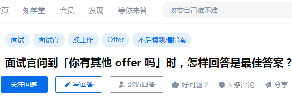 俗话说,金三银四,有没有最近换工作在参加面试的小伙伴,前段时间更新了很久,数据库SQL基础知识的面试题,不知道是否帮助到了你,感兴趣的小伙伴可以在“发消息”界面回复:面试题,获取SQL面试题合集。言归正传,说说今天逛知乎,发现了一个关于面试过程中很常见的问题,想着正在面试的小伙伴,可能会用的到,分享给大家参考学习下,知乎问题是:面试官问到「你有其他 offer 吗」时,怎样回答是最佳答案?