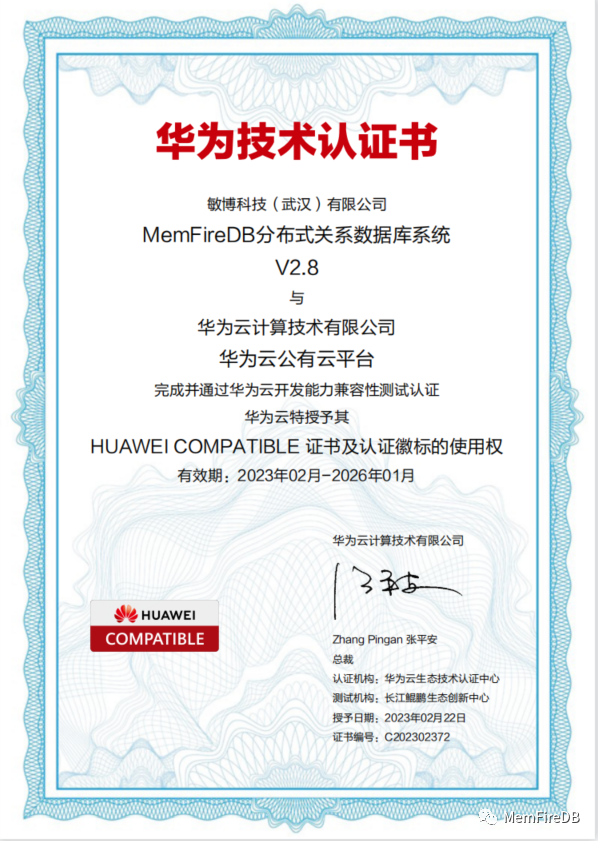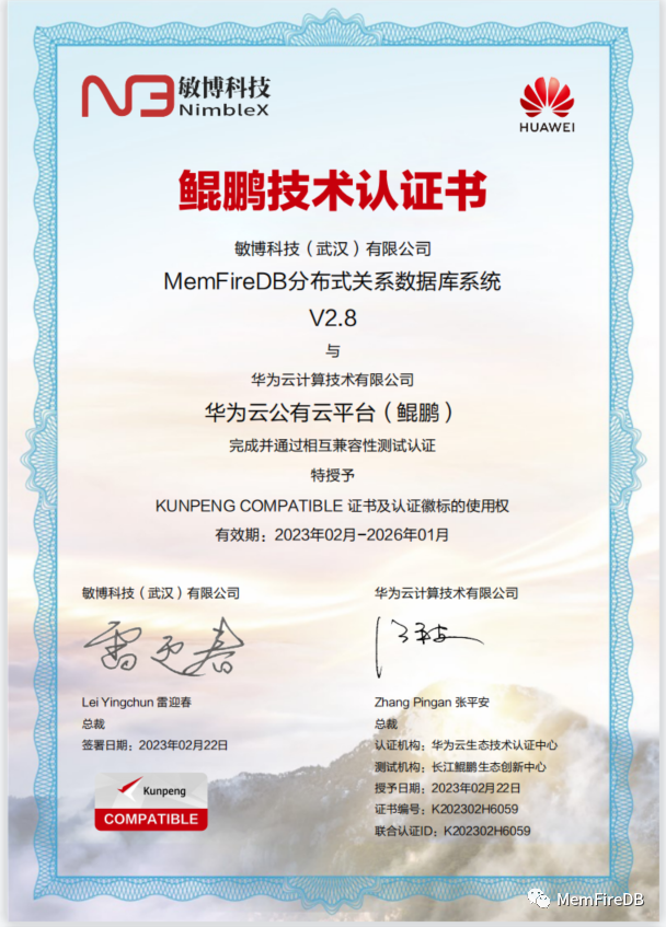 近日,敏博科技推出的MemFireDB分布式关系数据库系统 V2.8与华为云公有云平台(鲲鹏)完成并通过相互兼容性测试认证,成功获得鲲鹏技术认证证书。