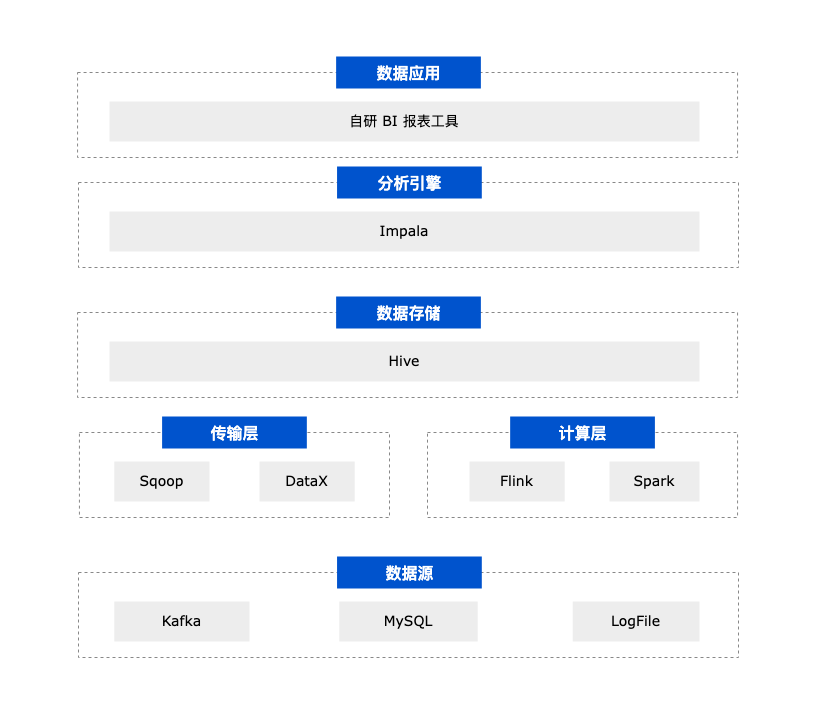 原始数据主要来自关系型数据库 MySQL 、消息队列 Kafka 以及采集到的日志数据; 利用 Sqoop 和 DataX 进行数据同步,通过 Flink 和 Spark 进行 ETL 以及 Yarn 和 Airflow 进行作业和任务调度; 处理完成的数据落入 Hive ,Impala 作为分析引擎,为上层自研的 BI 产品提供交互式分析服务;