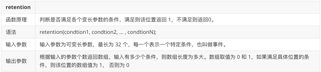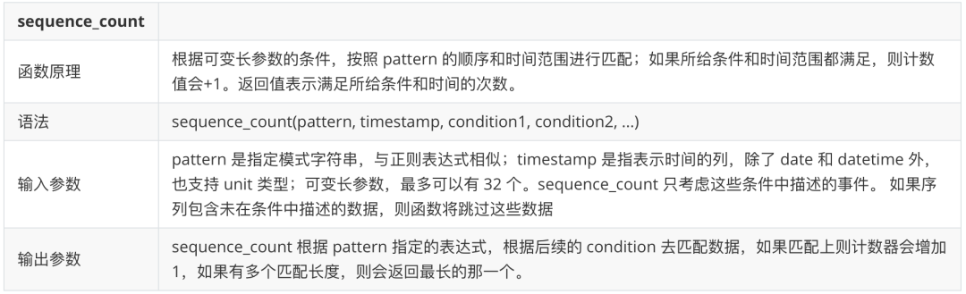 列匹配的条件。函数使用方法为:sequence_count((?1)(?t<3600)(?2), date, col1=1, col3='a')