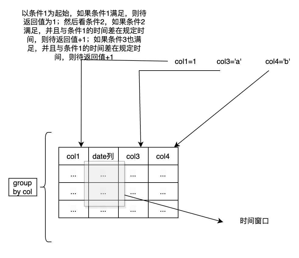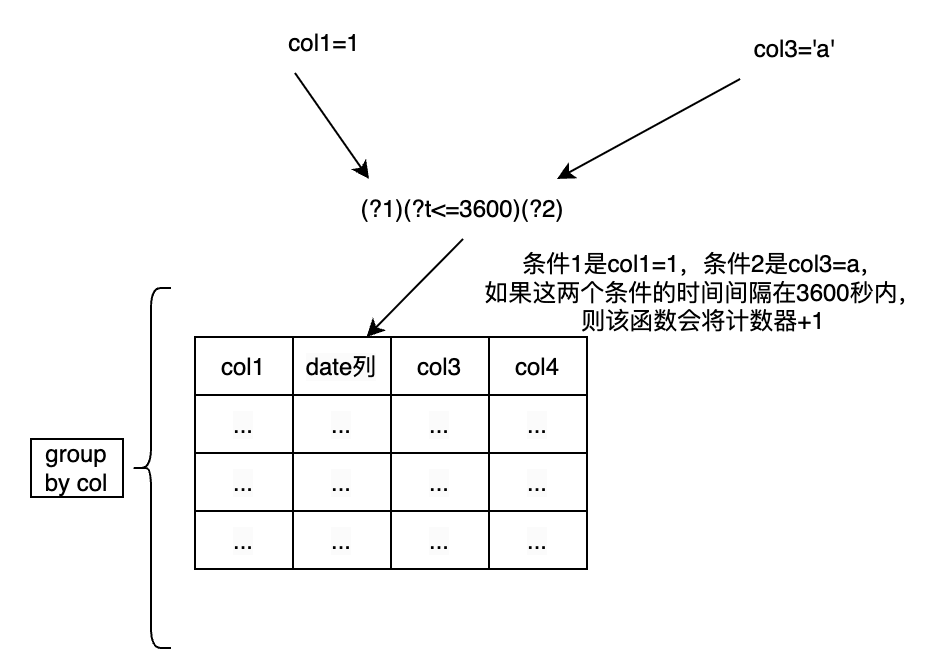 ,表明当前 col1=1 是第一个条件;此时如果有 col2=a,并且 col2 的时间与 col1 的时间在 3600 秒之内(col2 的时间减去 col1 的时间),则sequence_count