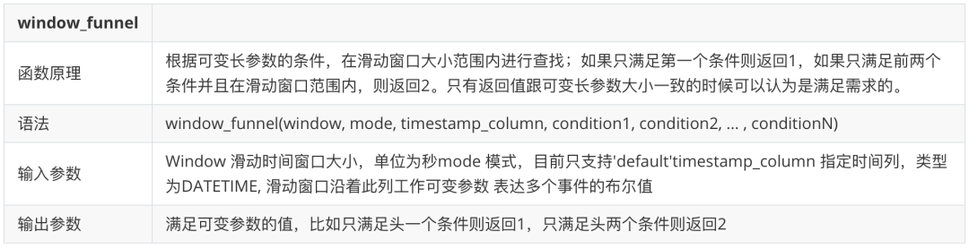 -- 从上述SQL可以看出,第一个参数120秒指定了滑动窗口的大小,并且窗口是按a_time这一列滑动的。act = 'login', act = 'view'是两个条件,显然用户111,222,333均满足这两个条件,即一小时内,先登录再观看广告;但是444这位用户就不满足先登录再观看广告,因为他只有登录操作,所以window_funnel对他返回了1,因为他只满足第一个条件