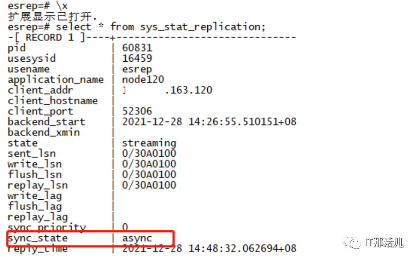 1 | node120 | primary | * running | | default | 100 | 9 | host=XXX.XXX.163.120 user=esrep dbname=esrep port=54321 connect_timeout=10 keepalives=1 keepalives_idle=10 keepalives_interval=1 keepalives_count=3