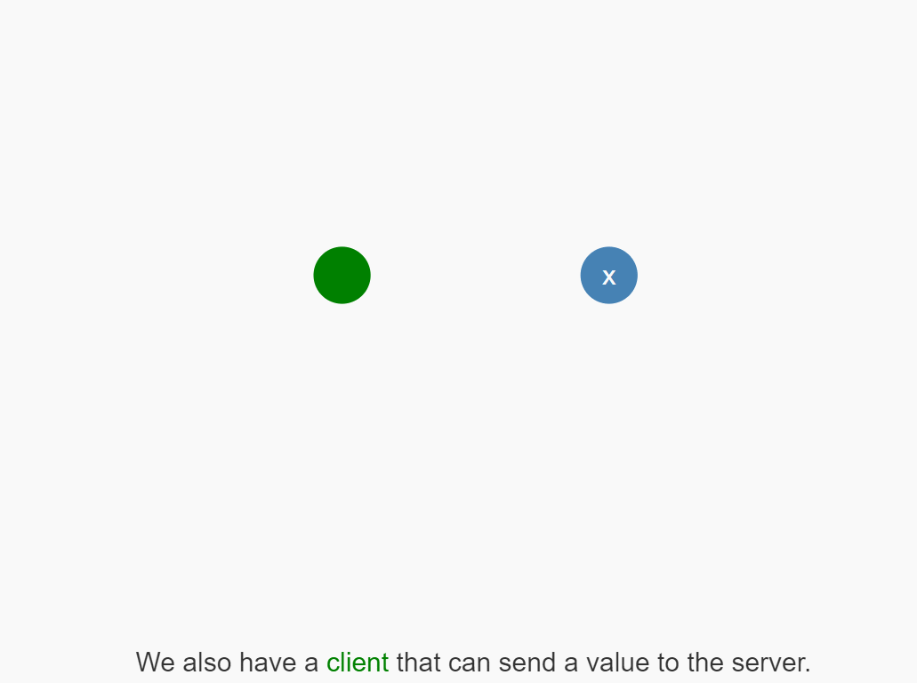 左边的绿点代表客户端,右边的蓝点代表服务器,当前是单节点的服务器。此时客户端将数字8,写入到服务器。在只有一个节点的情况下,很容易达成共识。但是当我们的服务器变成了多台机器。如何保证数据的一致性就变成了一个问题。