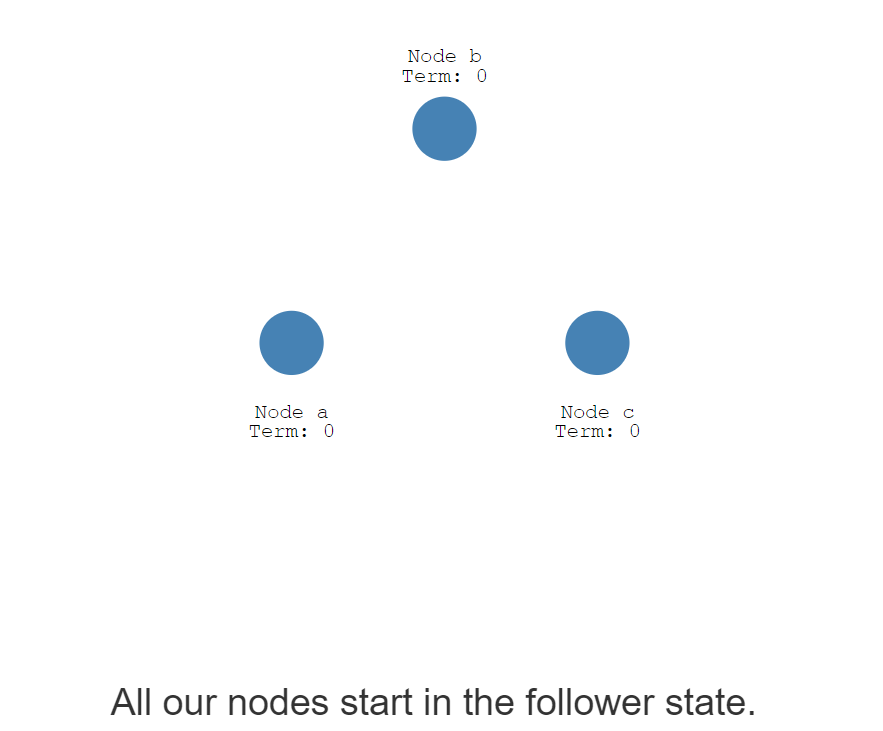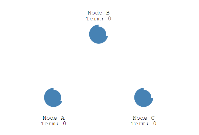 节点刚刚启动,Noad A、Node B、Node C全部进入到follower状态,同时创建一个超时时间在150ms-300ms之间的选举超时定时器。