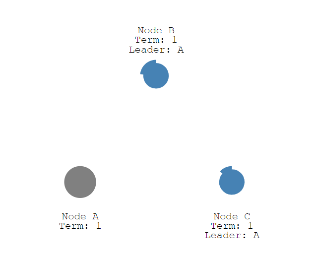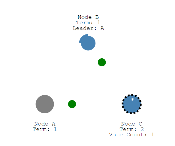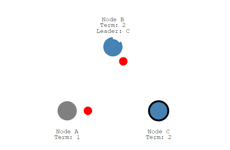 然后Node C就将请求大家投票的信息发送给Node A和Node B。因为Node A已经死掉了,现在就只能收到Node B的投票。
